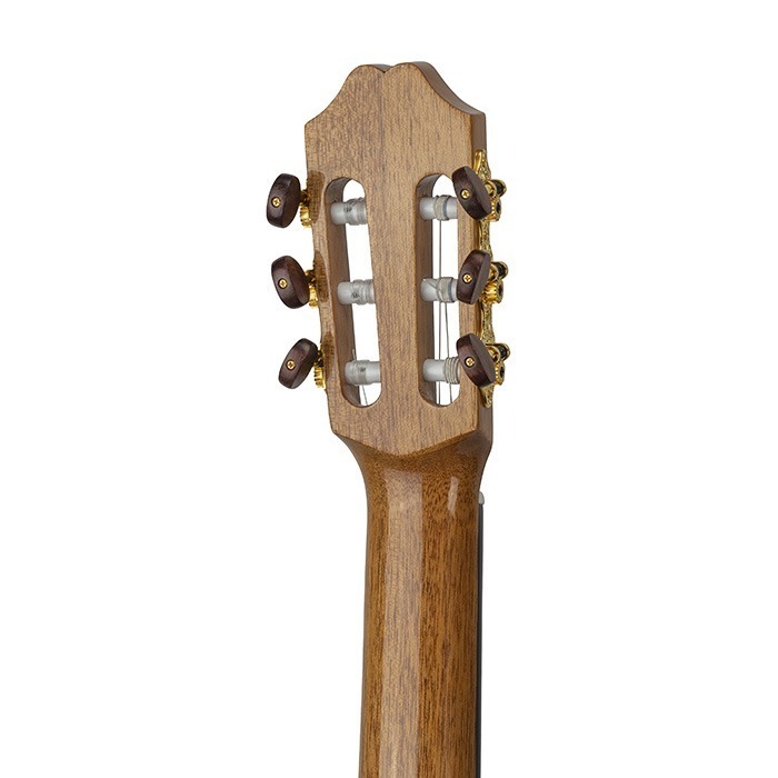 De verfijnde hals van Hondurese ceder wordt aangevuld met een toets en brug van hoogwaardig ebbenhout, terwijl een topkam en brug van been de sustain, articulatie en resonantie verbeteren. De vergulde stemmechanieken met knoppen van echt palissanderhout en botten rollers zorgen voor een nauwkeurige en betrouwbare stemming, terwijl de elegante houten rozet en de palissanderhouten rand de verfijnde afwerking van het instrument benadrukken.