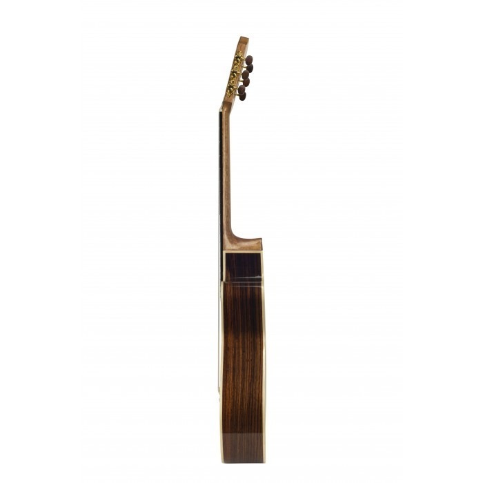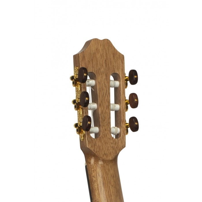 De Afrikaanse mahoniehals met ebbenhouten toets en brug, samen met een benen topkam en brugzadel, geven de klank extra sustain, projectie en articulatie. De vergulde mechanieken met benen rollers zorgen voor nauwkeurige en stabiele stemming, terwijl de hoogglans afwerking en houten rozet het ambachtelijke karakter benadrukken.
