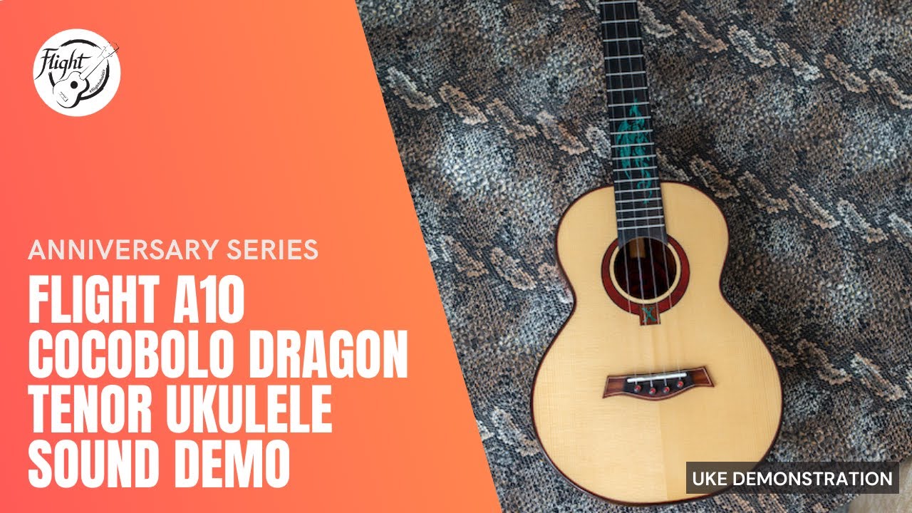 The Flight A10 SC Cocobolo Dragon Tenor Ukulele features an amazing combination of solid tonewoods that look amazing together and sound even better.  With a solid Engelmann soundboard and a solid cocobolo back and sides, the main centerpiece of the instrument is a turquoise dragon inlay on the fretboard.  The dragon is the symbol of Ljubljana, Slovenia, the home of Flight Ukulele.  The instrument also includes a redwood rosette with a Roman numeral “X” inlay for the 10th anniversary.  In addition to these features, the instrument also includes a special 10th anniversary headstock, black binding with a thin line of purfling, a pin bridge, Brazilian fluorocarbon strings, and an updated deluxe gig bag.  Simply put, this ukulele is a jaw-dropper!Flight Ukuleles is celebrating its tenth anniversary!  Flight has decided to celebrate its tenth anniversary by releasing four amazing tenor ukuleles.  While Flight is known for making high quality, affordably ukuleles, these anniversary models represent a new frontier for the company—solid wood ukuleles individually crafted by a master luthier, with a level of craftsmanship, playability, and sound rivaling the finest ukuleles on the planet.