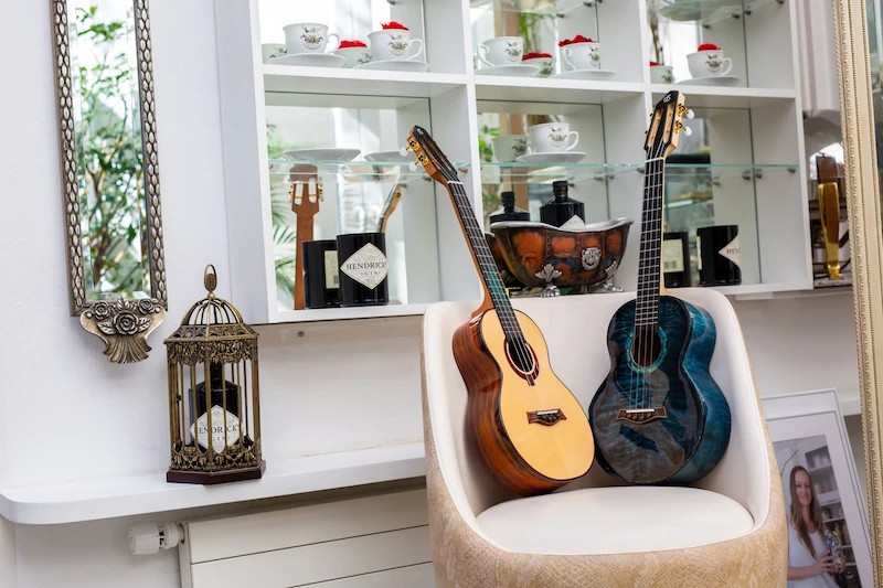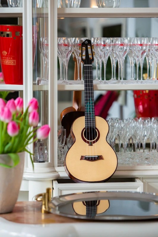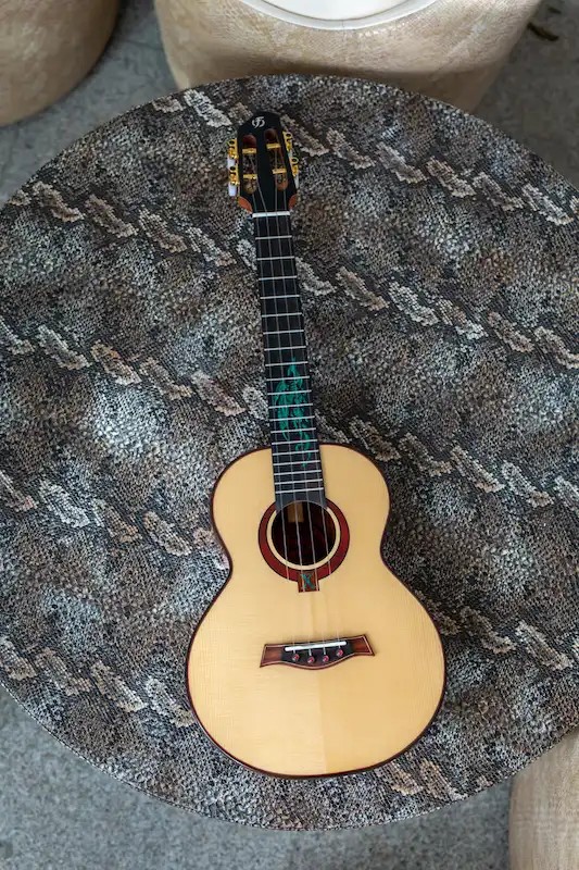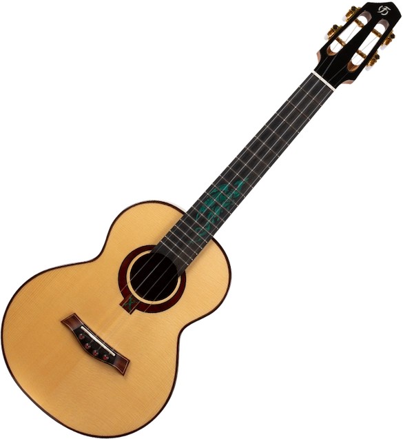 • Premium Features:  Top grade solid spruce soundboard, top grade cocobolo back and sides, mahogany neck, ebony fretboard and bridge, turquoise dragon fretboard inlay, black binding, redwood rosette, unique slotted headstock, pin bridge system, compensated saddle, Brazilian fluorocarbon strings.