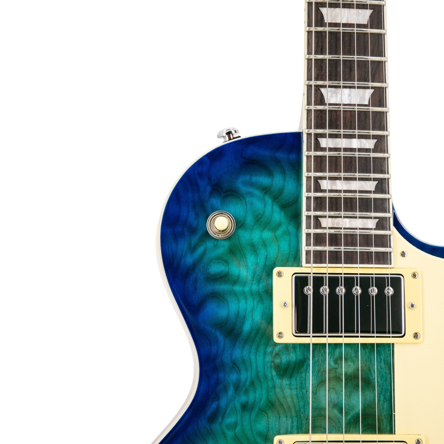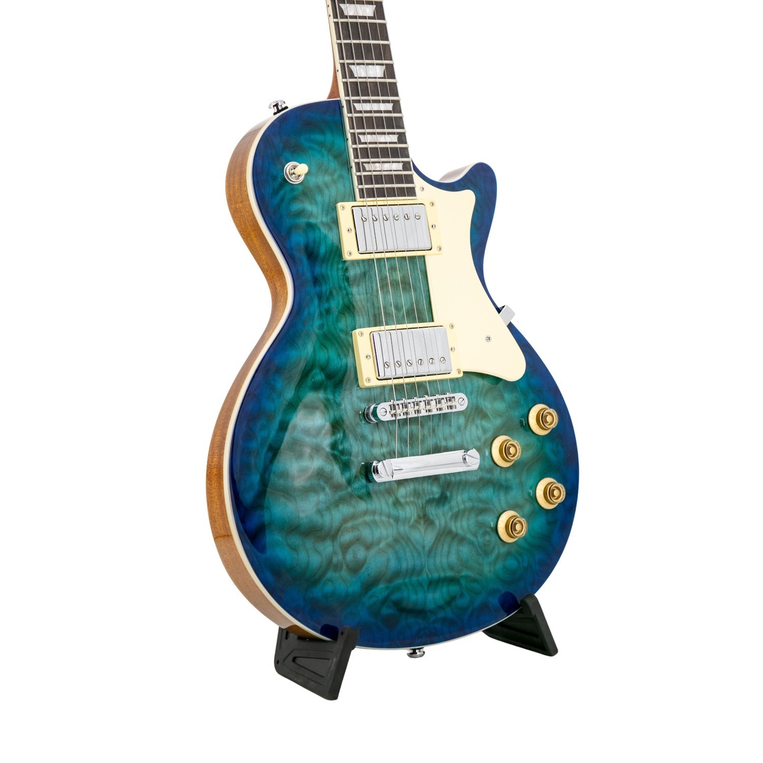 De gelamineerde mahonie hals verbetert sustain en resonantie, terwijl het comfortabele C-vormige profiel en de 24.75″ schaal lengte zorgen voor gebalanceerde snaarspanning en soepele bespeelbaarheid. Een compound-radius palissander toets (12″–16″) met jumbo frets maakt comfortabel akkoorden in lagere posities en vloeiende leadwerk hoger op de hals mogelijk. De gevormde hiel zorgt voor gemakkelijke toegang tot hogere frets, wat expressieve solo's en uitgebreide frasering aanmoedigt.