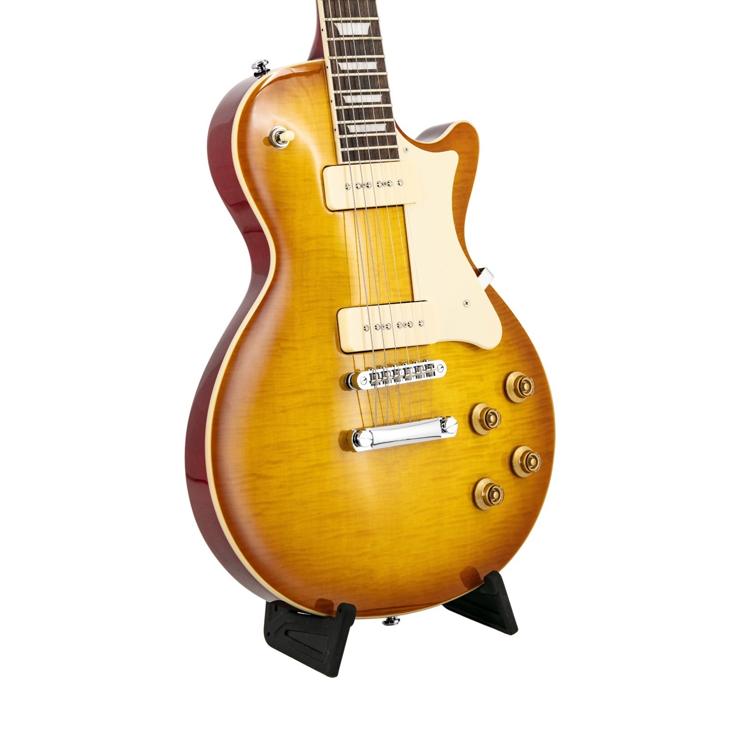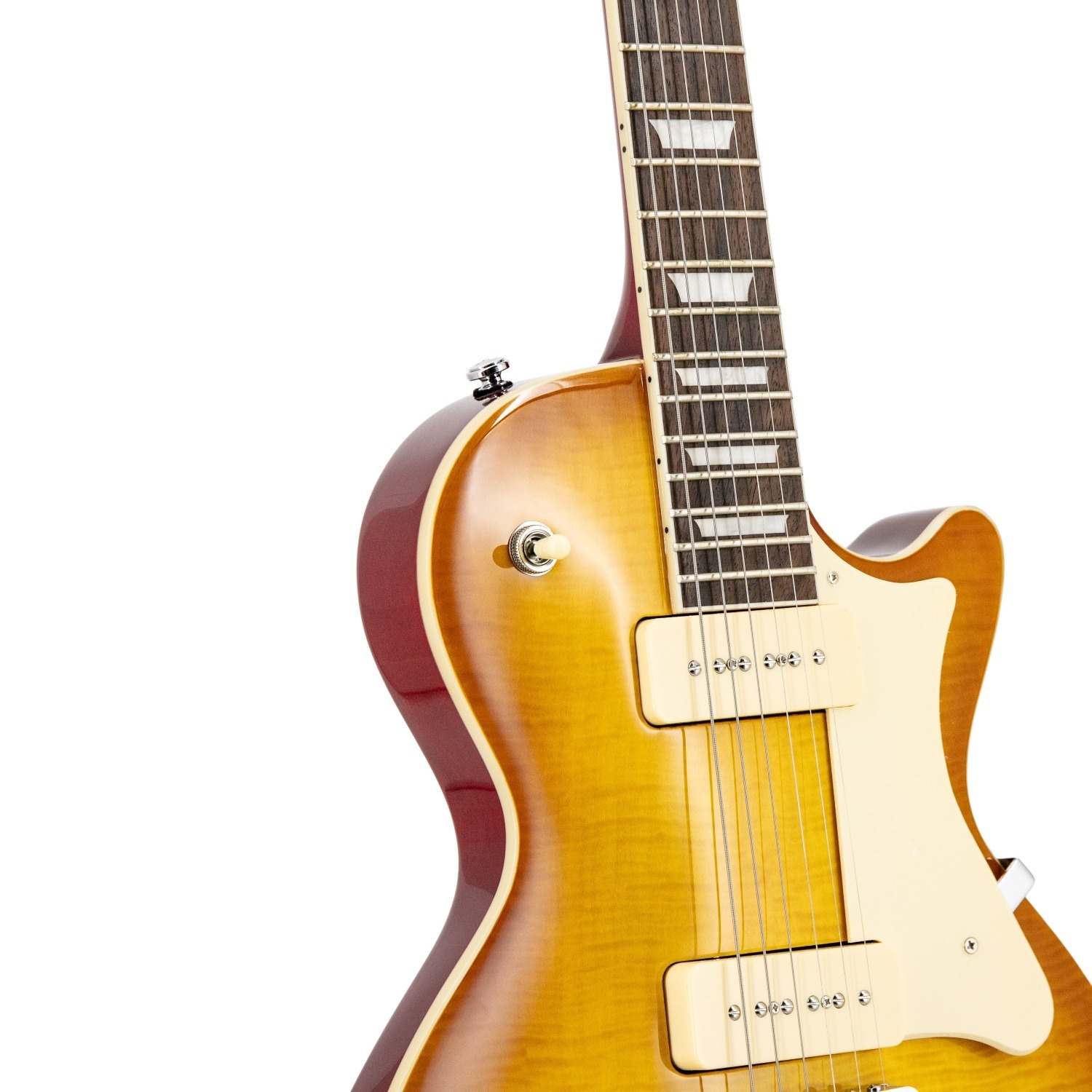 Afgewerkt in hoogglans met elegante binding, parelmoer trapezium inleg, chroom hardware, en gouden belknoppen, mengt de Ascent+ H-150 P90 tijdloos ontwerp met moderne prestatie-upgrades—een inspirerende elektrische gitaar voor spelers die vintage klank, premium gevoel, en podiumklare aanwezigheid eisen.