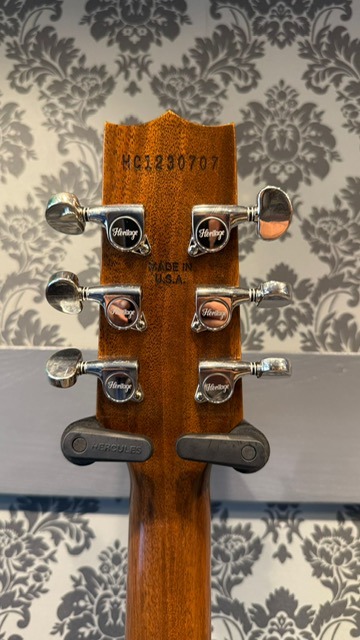 This guitar is fitted with our Heritage Custom 225 Classic humbuckers, which are simply amazing! Designed and wound in-house, these vintage-inspired pickups are tuned for the Heritage Core Collection H-150 and excel in both clean and overdriven tones. I'm thrilled to tell you about the other notable features! You'll love the '50s C-shaped neck profile, the locking bridge with an aluminum stopbar tailpiece. The stinger headstock features a stunning holly veneer, proudly displaying the 'Heritage' logo with a captivating twin-arrow inlay.