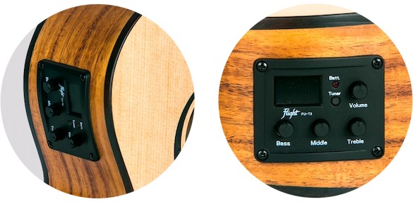 Light or dark? Choose both! The DUS320 CEQ is a true all-rounder ukulele. The laminate spruce top and laminate zebrawood sides combine to deliver a sound that is punchy and bright when soloing in the high register and warm and velvety when thoughtfully strumming by the fireplace. Finally, you can have it both ways!  The pickup, not usually installed on sopranos, features a tuner, saving you a headache of remembering where placed the tuner the night before. And of course, you have  the freedom to plug-in wherever and whenever you like, giving this tiny uke a chance to shine on stage!
