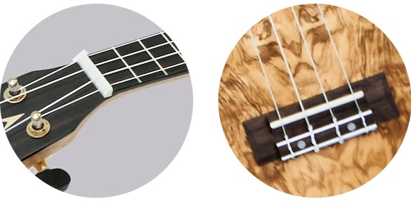 • Premium Features: Arched back, Chrome Die-Cast Geared Tuners, Maple Inlaid Rosette, Aquila Super Nylgut Strings, Side Dots.