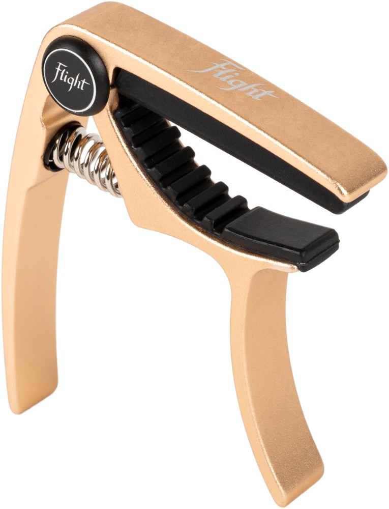 Flight offers a growing selection of ukulele accessories, such as this gold capo. Sized specifically for the ukulele, the Flight FC-GD Capo is made from aluminum.  The spring loaded mechanism of the capo allows you to quickly change the key of your instrument, allowing your music to take Flight in whatever key you choose.