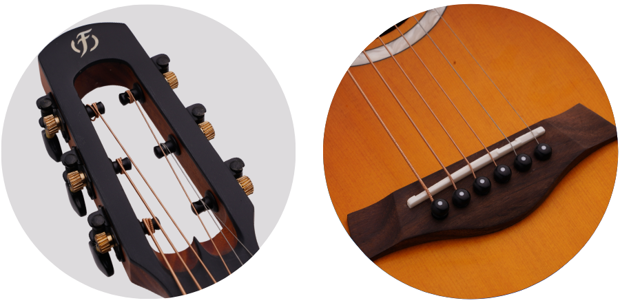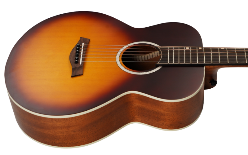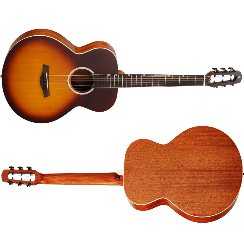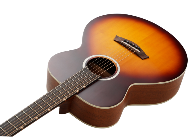De PIXI TSB heeft een prachtige sunburst massief sparren bovenblad en gelamineerde mahonie achterkant en zijkanten, die een heldere en gebalanceerde toon levert met veel projectie en warmte. Sparren zorgt voor helderheid en articulatie, terwijl mahonie diepte en rijkdom toevoegt aan de middentonen en lage tonen. Het resultaat is een levendig en vol geluid dat verrassend krachtig aanvoelt voor zo'n compact instrument.