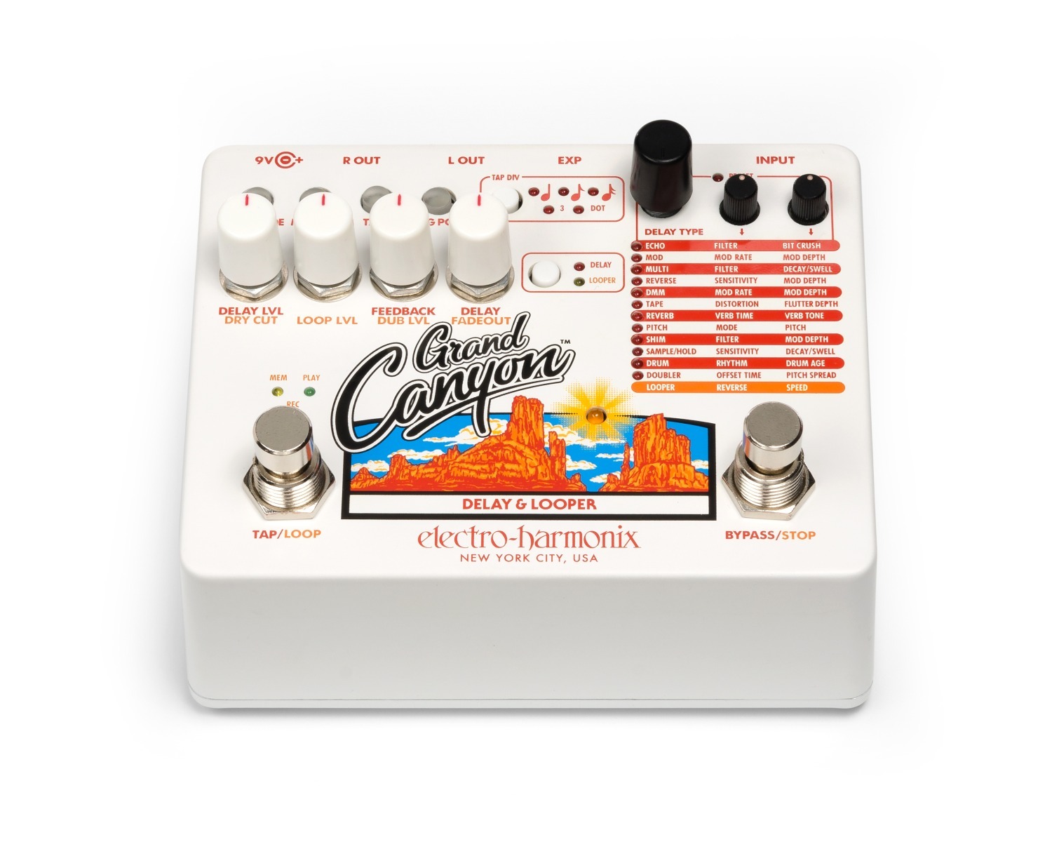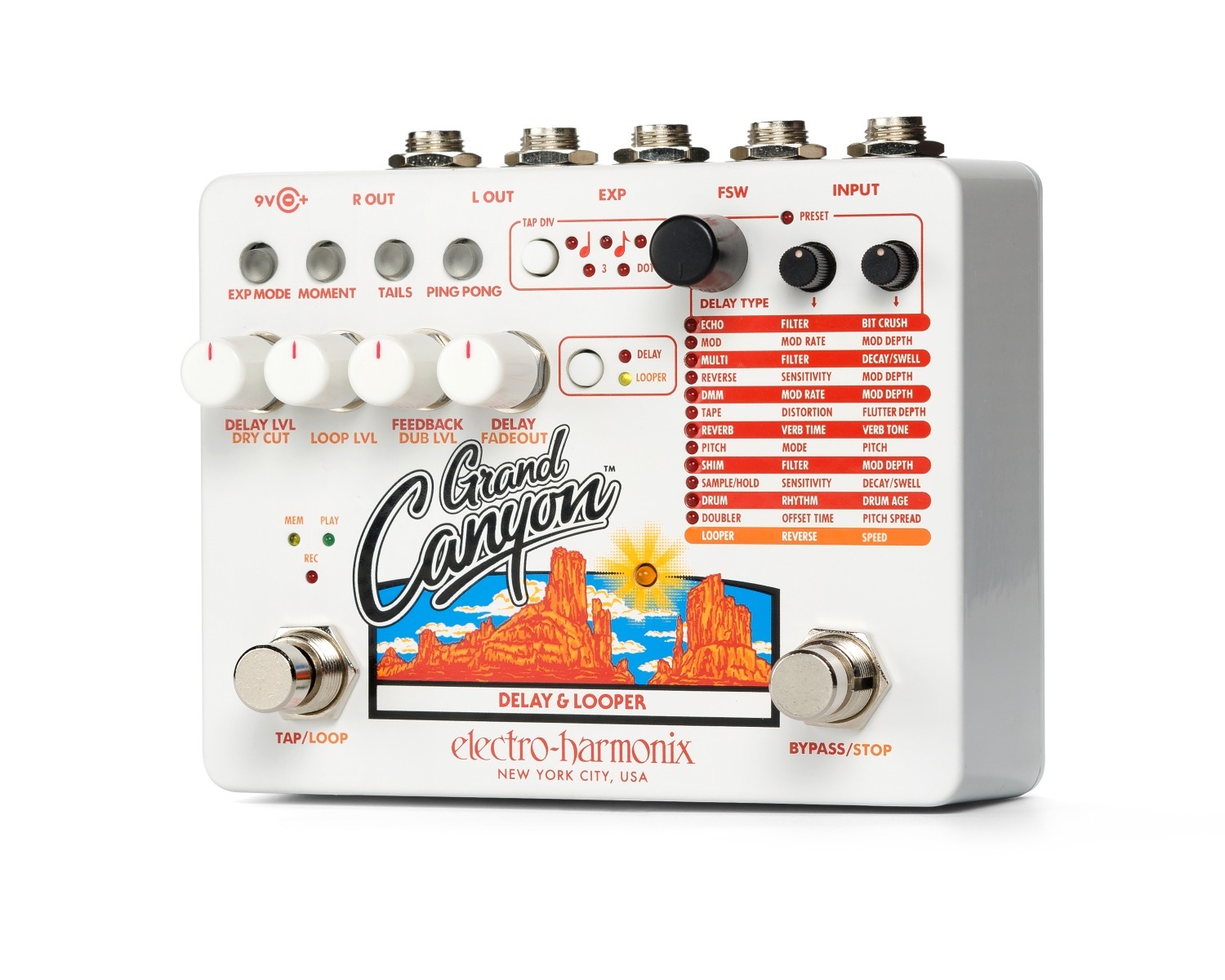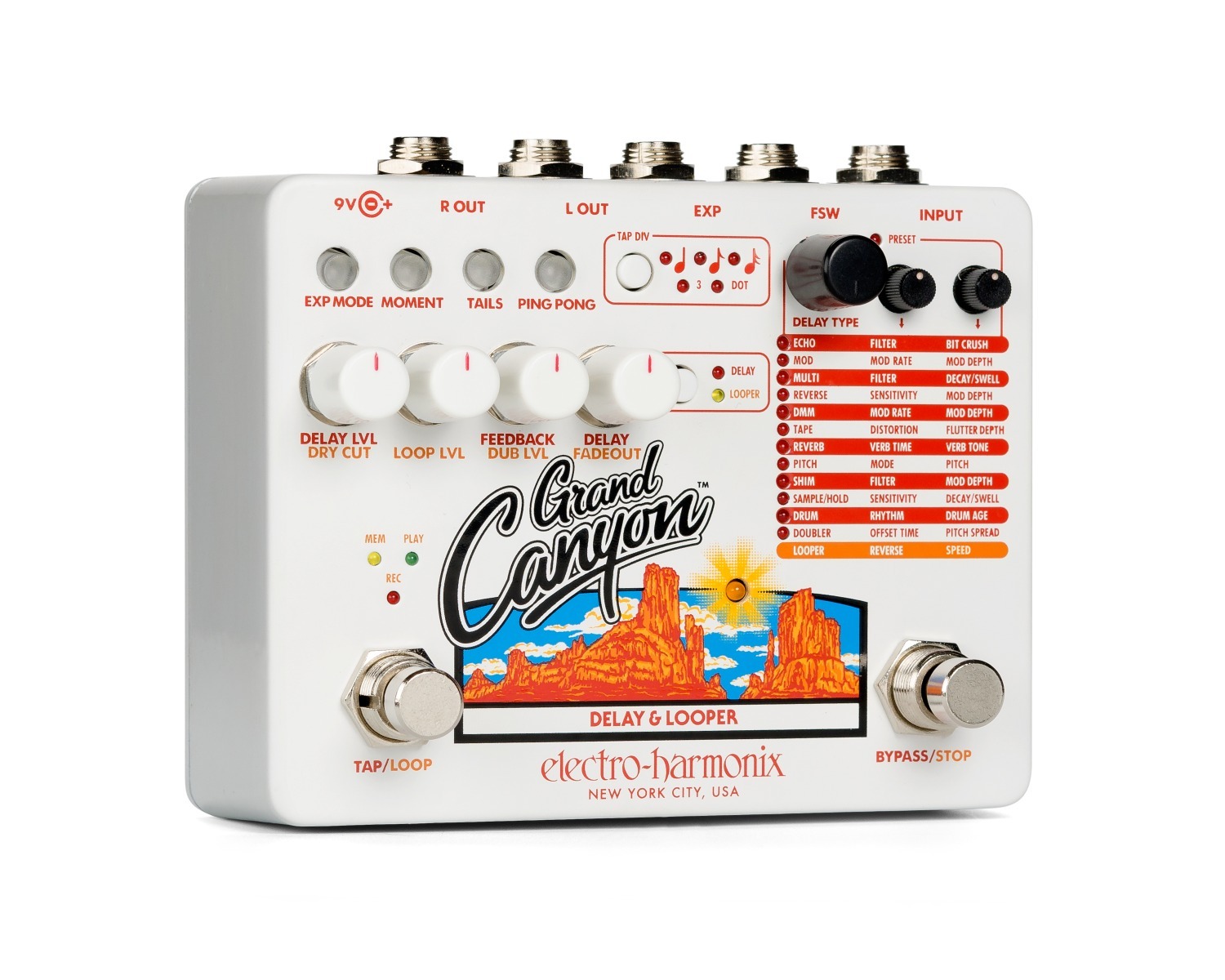 De Electro-Harmonix Grand Canyon tilt de geliefde Canyon-serie naar een hoger creatief niveau. Met twaalf delaytypes — van Tape en Reverse tot Shimmer, Mod en multi-tap — plus een looper van zestien minuten, levert dit pedaal studiokwaliteit in een compact formaat.