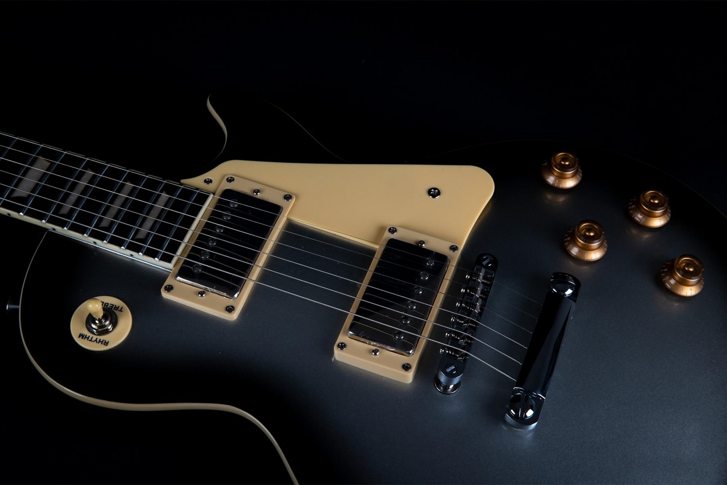 De HH configuratie bestaat uit dubbele bedekte humbuckers die worden bediend via een 3-weg selectieschakelaar, met onafhankelijke volume- en toonregelaars. Een vaste brug met stop tailpiece zorgt voor solide intonatie, directe snaarrespons en stemstabiliteit.