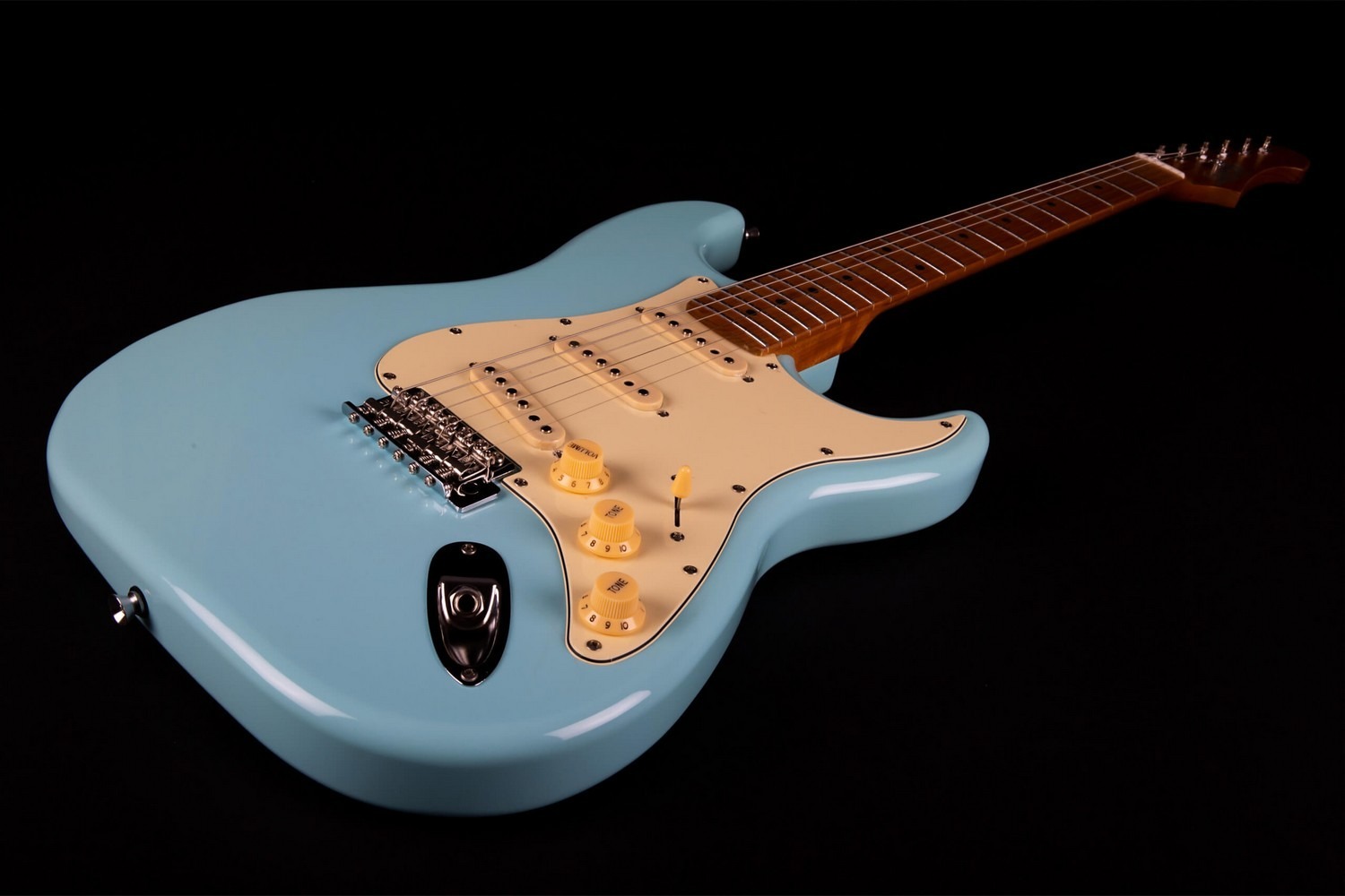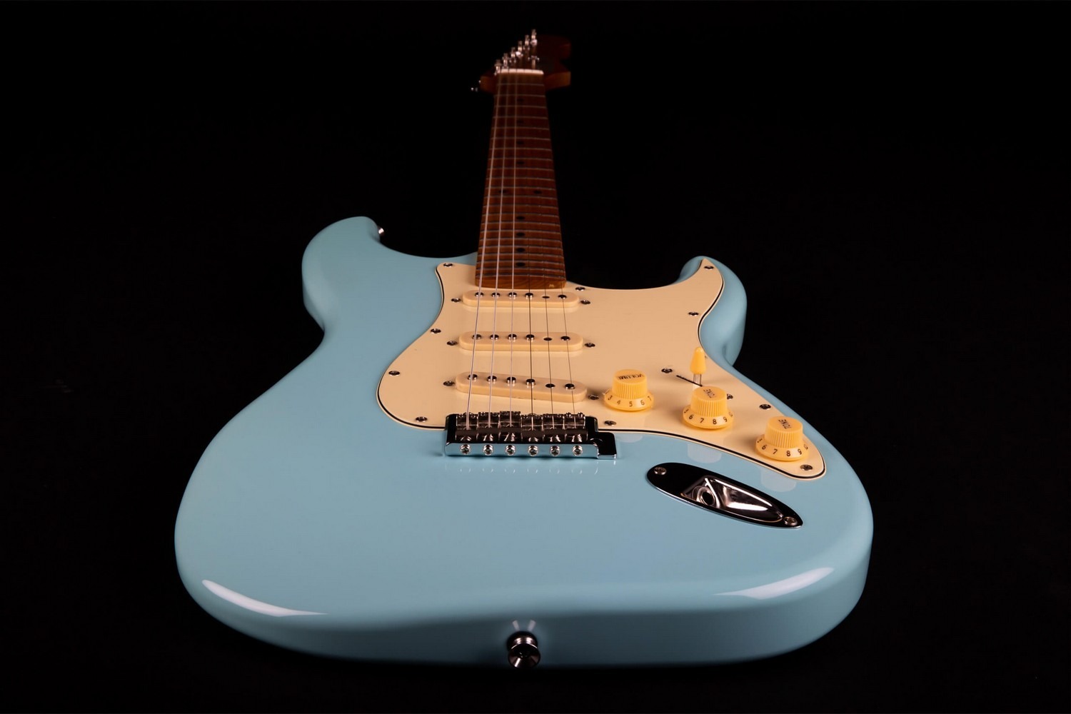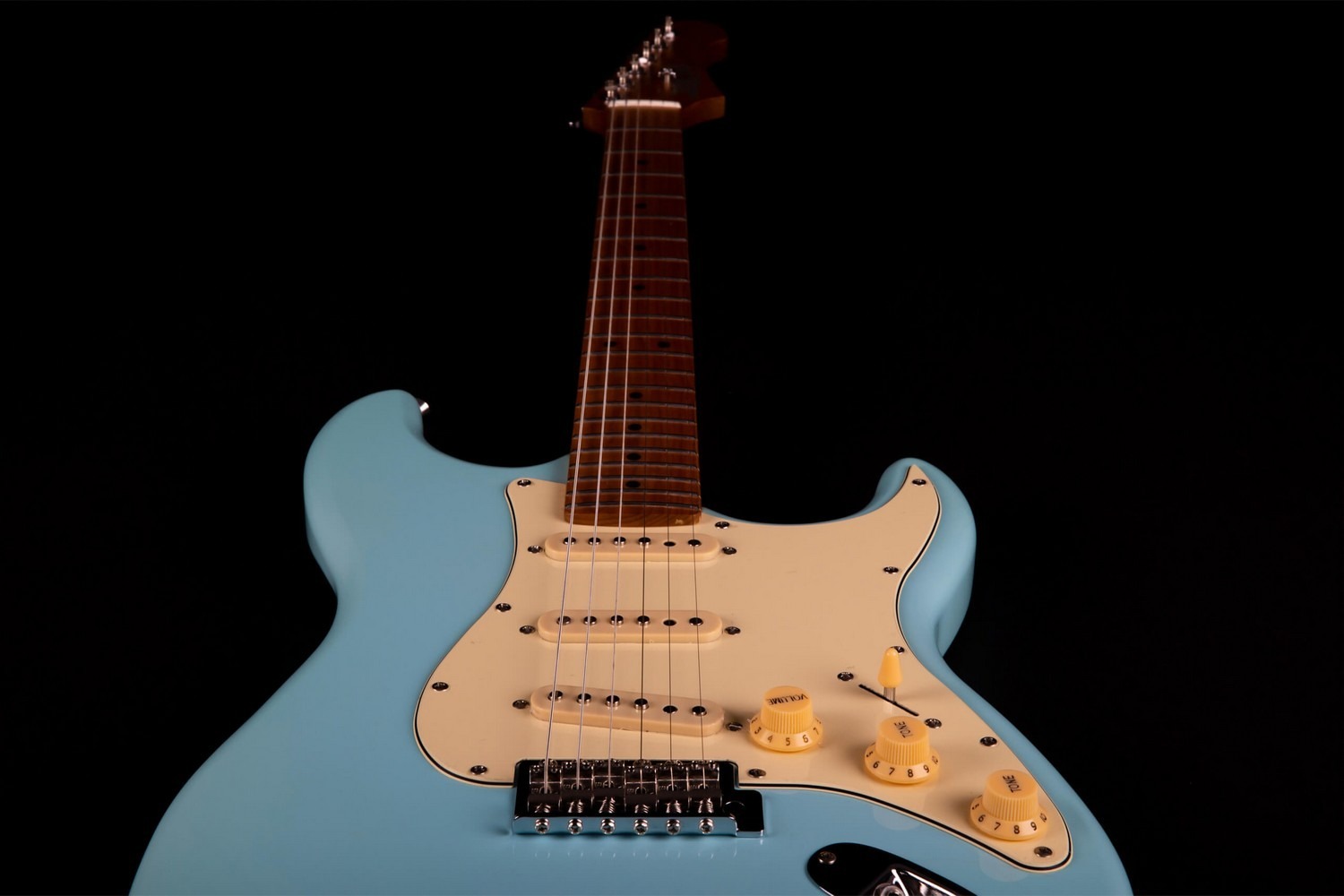 De JS-300 heeft een solide populieren body gecombineerd met een bolt-on Canadese geroosterde esdoorn hals voor stabiliteit en consistentie. De geroosterde esdoorn toets is gebouwd met een vintage-stijl 9.5” radius en uitgerust met 22 frets, wat een vertrouwd platform biedt voor zowel akkoorden als leadspel. De 25.5” mensuurlengte zorgt voor de traditionele snaarspanning en respons die geassocieerd wordt met klassieke S-stijl elektrische gitaren.