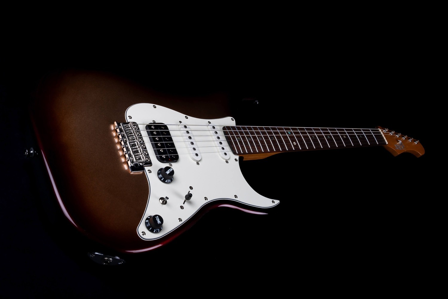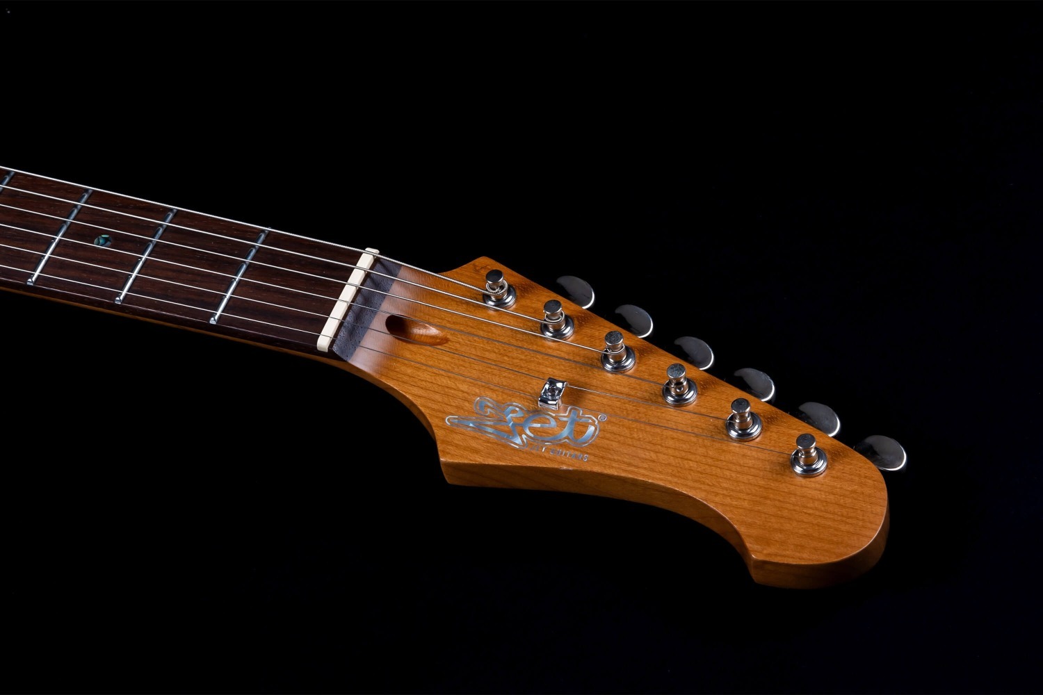 De body is geconstrueerd uit drie-delige populier, wat zorgt voor een gebalanceerde resonantie en structurele consistentie. De bolt-on kwartgezaagde lichte geroosterde esdoorn hals verhoogt de stabiliteit en duurzaamheid, in combinatie met een Indiase rozenhouten toets met een 9.5” radius, 22 medium jumbo frets (2.6 mm), en abalone ronde stip inleg. De 25.5” schaal lengte en C-vorm halsprofiel behouden de klassieke S-stijl speelbaarheid met gecontroleerde respons.