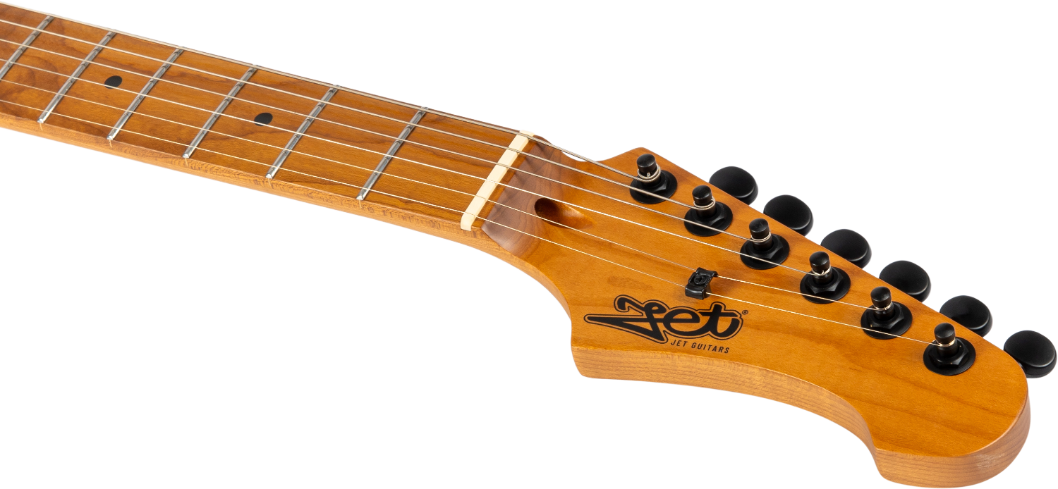De JET JS-500 Direct Mount versie brengt het S-stijl platform verder in moderne zware styling. Met behoud van de dubbele snede lichaamsvorm, verwijdert deze variant de traditionele pickguard en heeft directe gemonteerde pickups voor een schonere, agressievere esthetiek.
