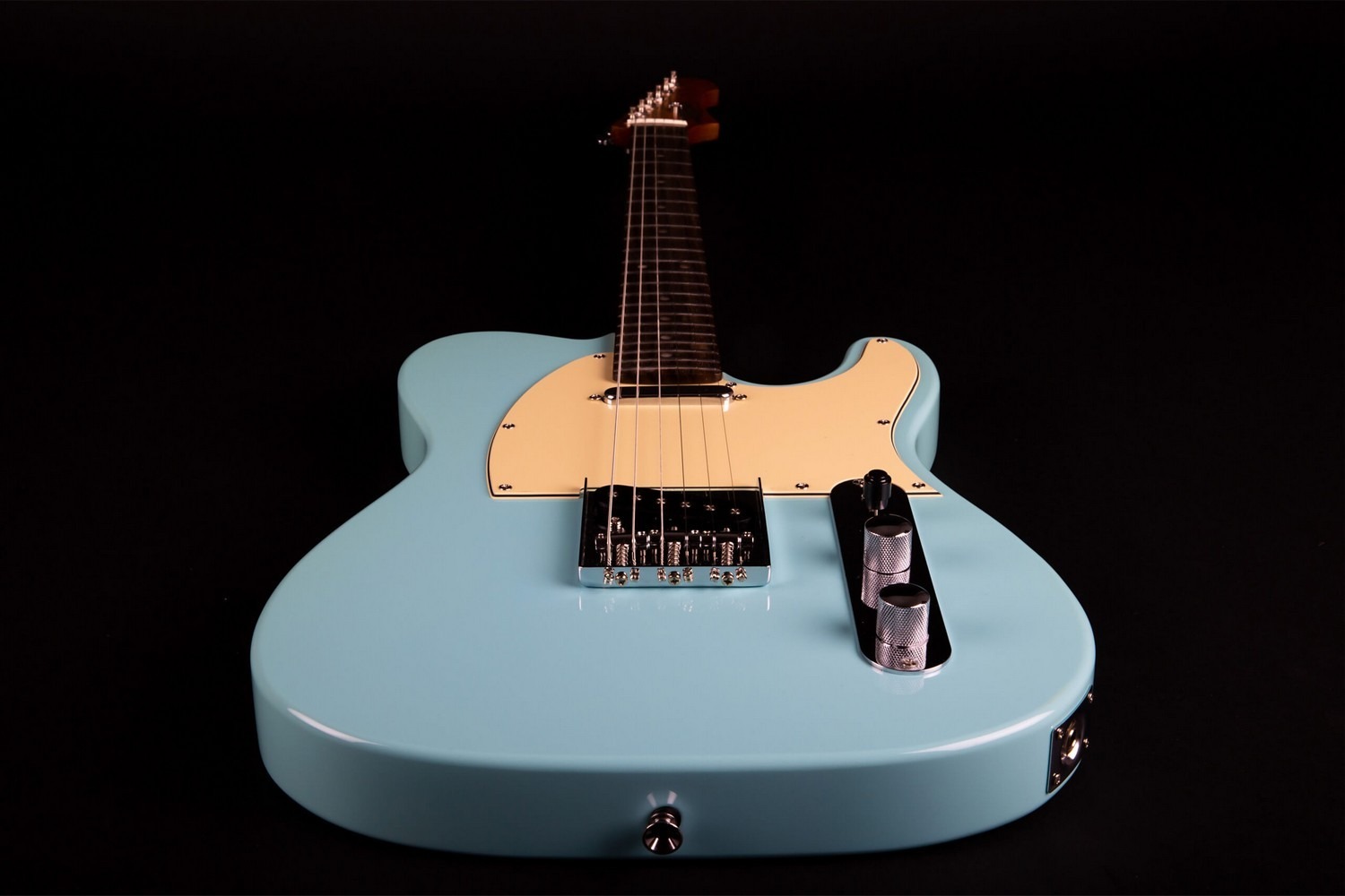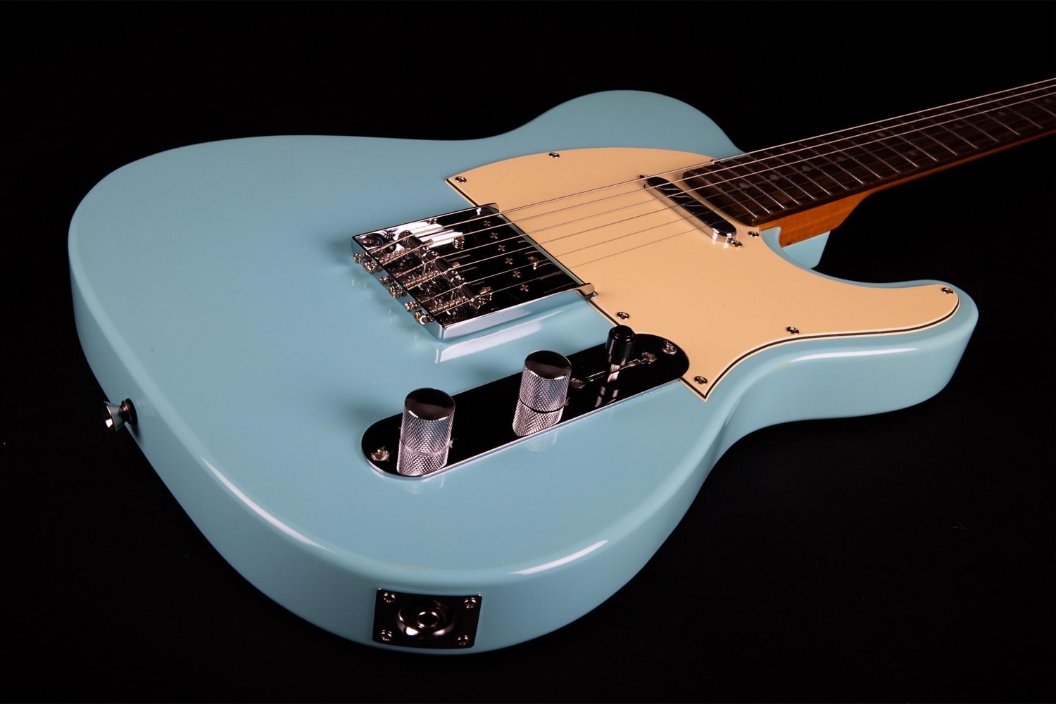 De SS pickupconfiguratie bestaat uit twee single-coil pickups en een 3-weg selectieschakelaar, die klassieke T-stijl toonopties biedt. De controle-indeling omvat master volume en toonregelaars voor eenvoudige toonaanpassing.