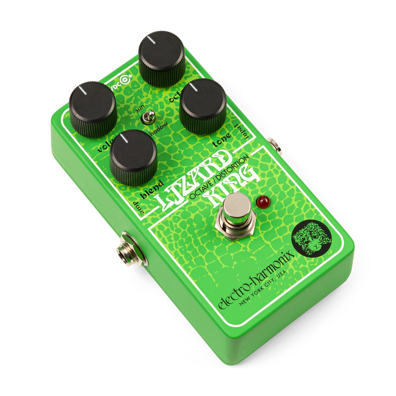 De EHX Lizard King is een fuzz met vaste versterking die dynamisch responsief is. Aanpassingen aan het volume van je instrument beïnvloeden de hoeveelheid fuzz. Lagere instrumentvolumes creëren een heldere, vage overdrive, terwijl een volledig instrumentvolume de versterking over de top stuurt voor scheurende riffs en branderige solo-tonen. De bekende VOLUME en OCTAVE knoppen regelen respectievelijk de algehele output en het volume van de octaafmix. Nieuw bij de Lizard King, de BLEND-knop stelt de mix in tussen je schone en fuzz tonen om de perfecte balans van fuzz te creëren terwijl je de aanval en het laag van je bas behoudt. De TONE-knop is een laagdoorlaatfilter dat de hoge tonen dempt, terwijl de SUN/SHADOW schakelaar de toon van de octaaf fuzz en schone tonen verder verbetert. SUN versterkt de octaaf fuzz met een meer aandrijvende middenfrequentie, en de schone toon die toegankelijk is via de BLEND-knop heeft meer hoge en lage frequenties. Wanneer de schakelaar op SHADOW staat, blijft de schone toon onveranderd en is de fuzztoon strakker.