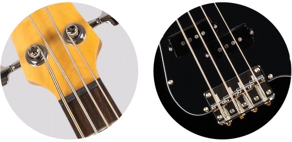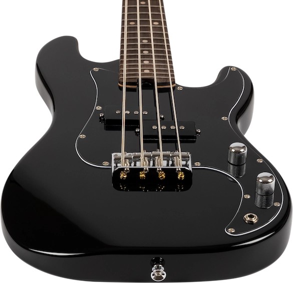 • Premium Features: Mini Bass, electric bass, metal strings, solid body, comfort styling, poplar body, maple neck, and inlay position markers, side position markers, closed geared bass tuners, Alnico 5 P-Style pickups, chrome volume control, chrome tone control, hardtail fixed bridge.