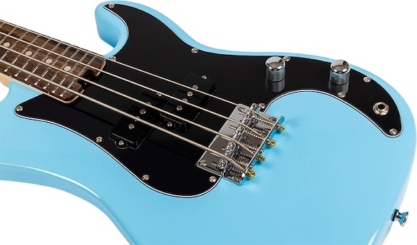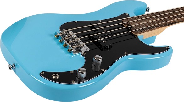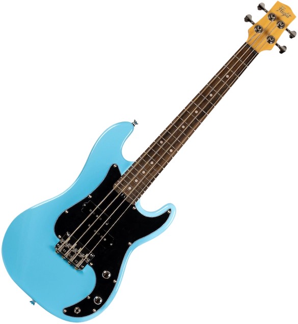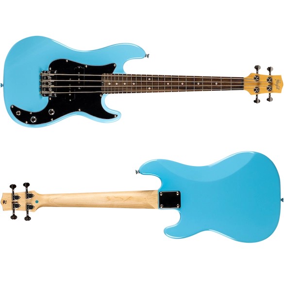• Premium Features: Mini Bass, electric bass, metal strings, solid body, comfort styling, poplar body, maple neck, and inlay position markers, side position markers, closed geared bass tuners, Alnico 5 P-Style pickups, chrome volume control, chrome tone control, hardtail fixed bridge.