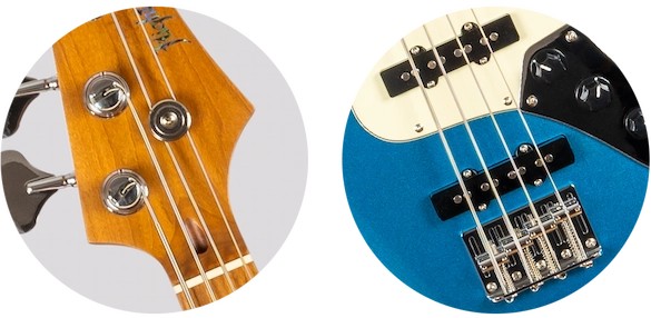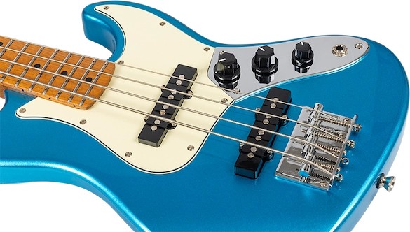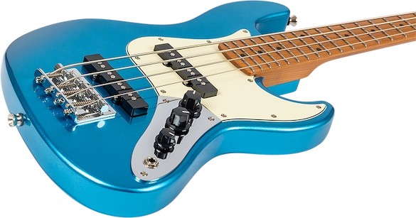 • Premium Features:  Mini Bass, electric bass, metal strings, solid body, JB style, roasted poplar body, roasted maple neck, inlay position markers, closed geared bass tuners, SS pickups, 2V 1T controls, 3 knobs, passive circuit, chrome hardware.