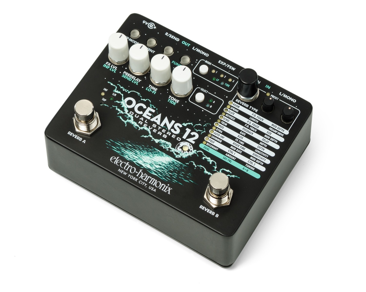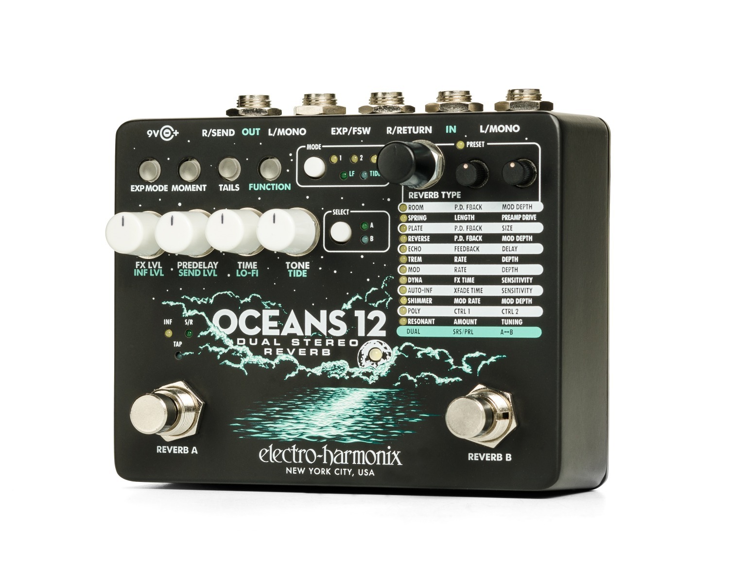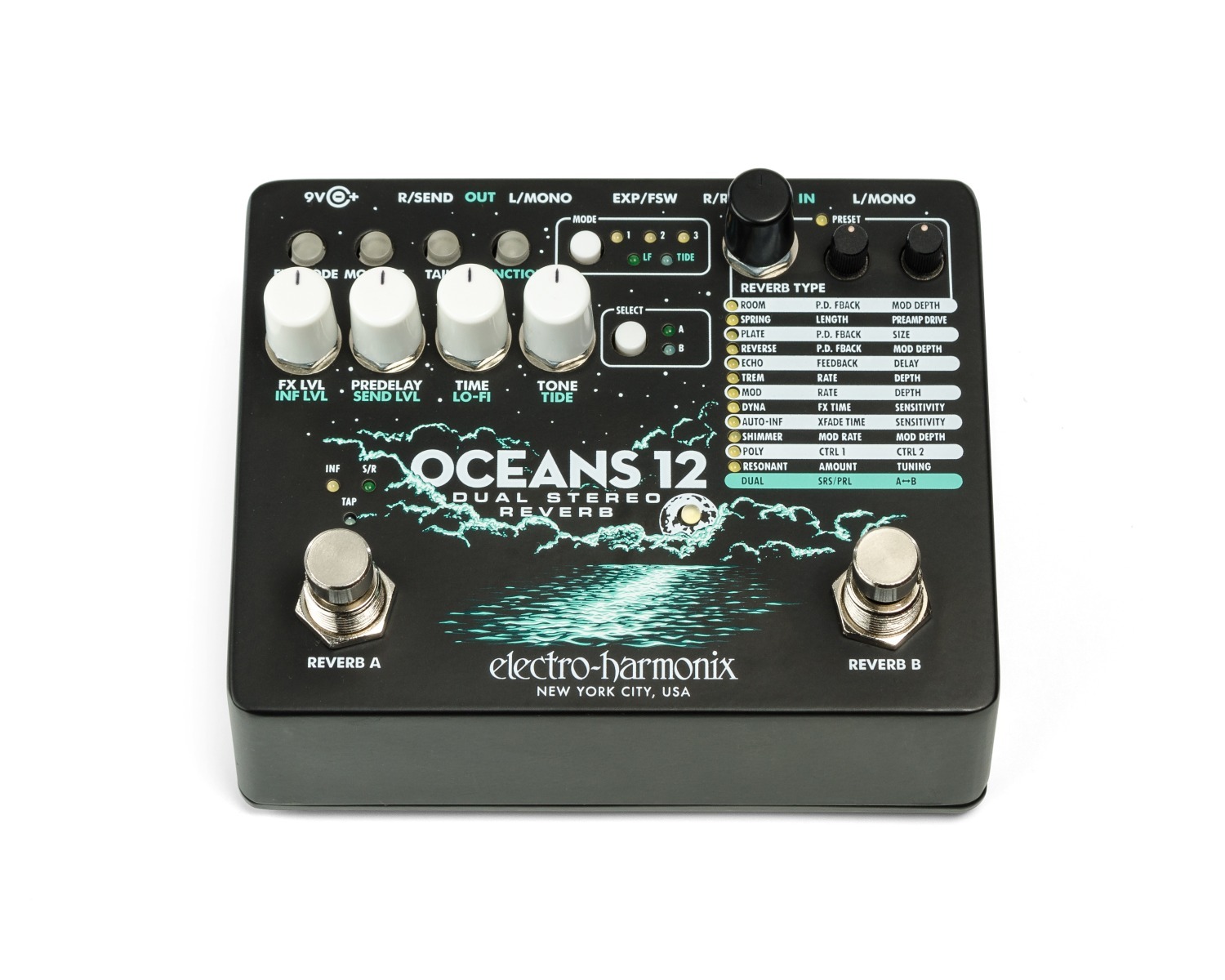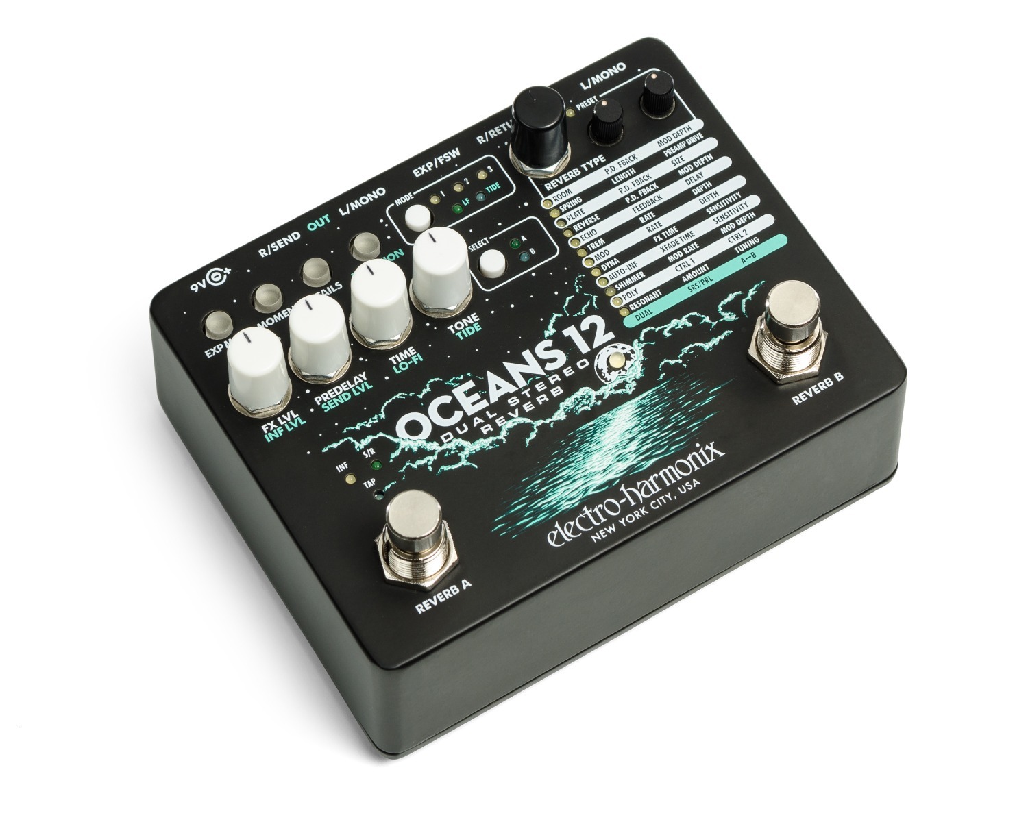 De Electro-Harmonix Oceans 12 tilt reverb naar een hoger niveau met twee volledig onafhankelijke stereokanalen die parallel of in serie kunnen werken. Twaalf verschillende algoritmes — waaronder Hall, Spring, Shimmer, Reverse en Echo — bieden eindeloze mogelijkheden voor ruimtelijke klankcreatie. Elk kanaal heeft afzonderlijke controle over pre-delay, EQ en modulatie, zodat je tot in detail kunt vormgeven. Met stereo in- en uitgangen, tap-tempo en expressie-ingang is dit een professionele galmmachine voor podium, studio en sounddesign.