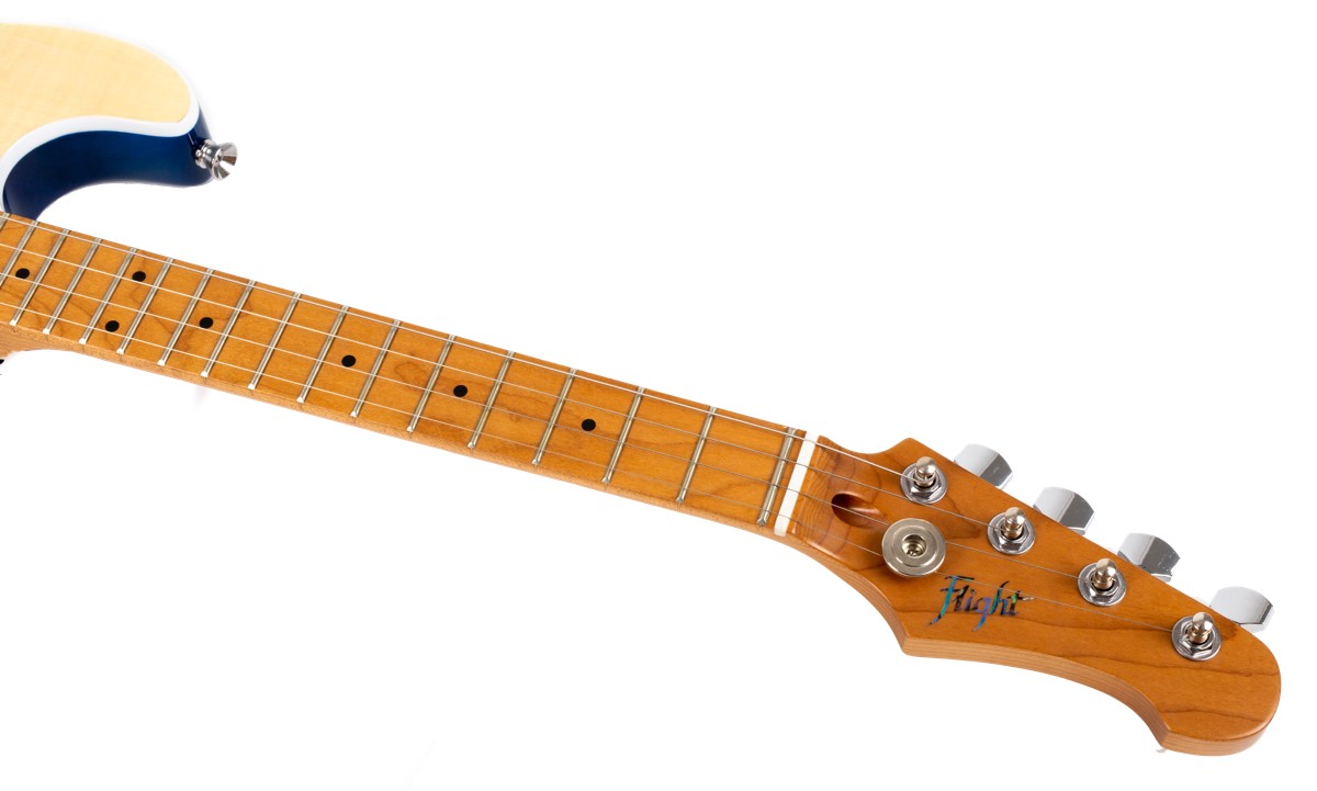 Are you ready to rock? The Flight Pathfinder, Transparent Blue,  Solid Body Tenor Ukulele is a dual cutaway steel string electric ukulele, offering the tonal possibilities of a true electric ukulele from the trusted name of Flight Ukulele. The ukulele itself is stunnning with a gradient blue flamed maple top with blue basswood body and neck. The ukulele features a maple neck, inline headstock, white ABS binding, hardtail fixed bridge, back-through stringing, humbucker and single coil pickups, chrome hardware, single controls for volume and tone, and a three way switch. With its classic looks and fantastic sound, you’ll be ready to rock in any venue, as well as to add any effect pedals, or stompboxes to your final amplified sound. Flight Electric Ukuleles represent great value and high quality–so buy yours today and take Flight on your electric journey!