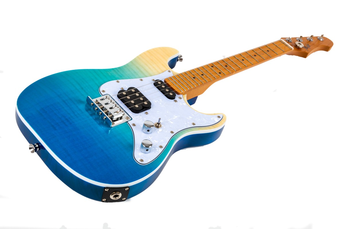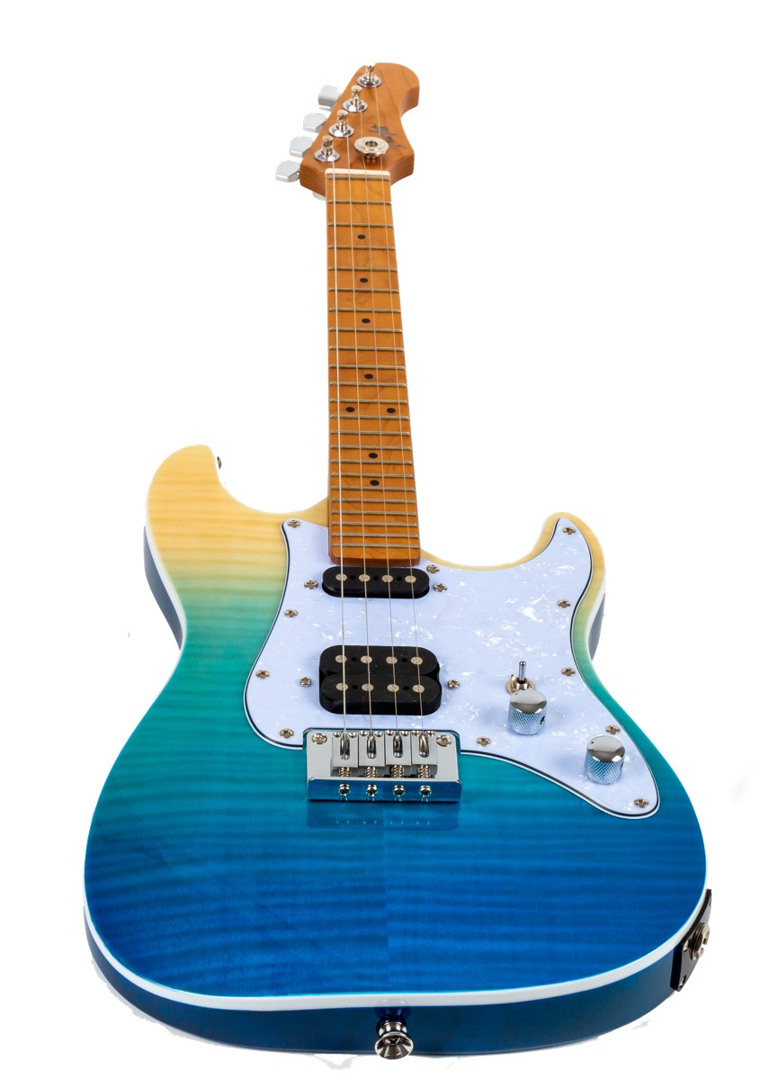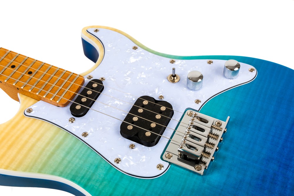 • Premium Features: Tenor ukulele, electric ukulele, solid body, metal strings, dual cutaway, flame maple blue gradient top, basswood body, roasted maple neck, bone nut, closed geared tuners, zero fret, linear headstock, black front position markers, side position markers, white ABS binding, chrome controls, humbucker and single coil pickups, controls for volume and tone, three-way switch, and hardtail fixed bridge.