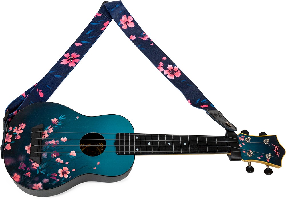 A beautiful ukulele strap to match our TUS-32 Sakura Travel ukulele. Featuring a mesmerizing cherry blossom design on a dark background, this strap is for those who appreciate beauty.The strap adjusts in length and features high quality leather strap ends and a leather tie-back. Flight wants you to be able to focus on being the best musician you can be, and a strap can help you with that process. Ukulele straps look great, offer peace of mind, provide comfort, and liberate your chording hand to be able to move up and own the neck without worrying about how to hold and support your ukulele.