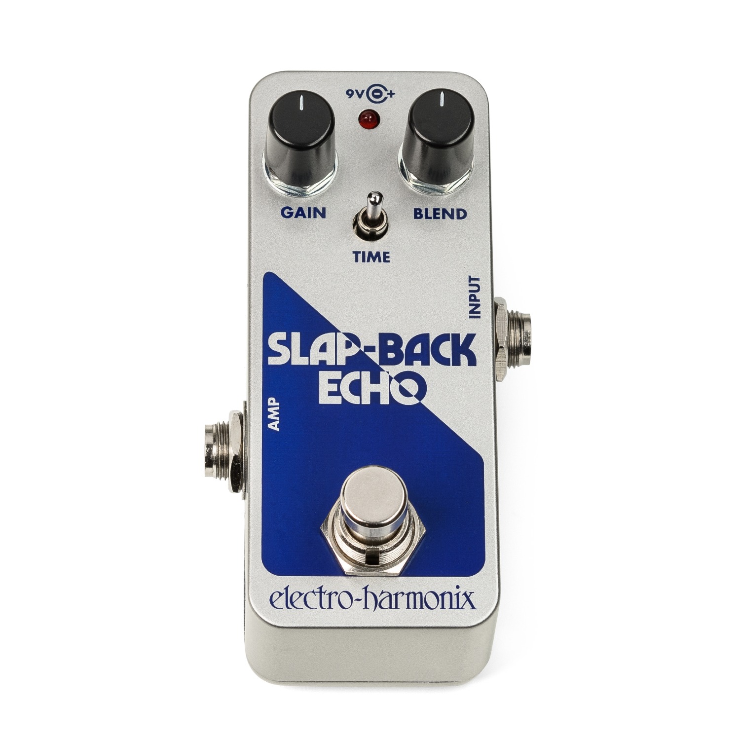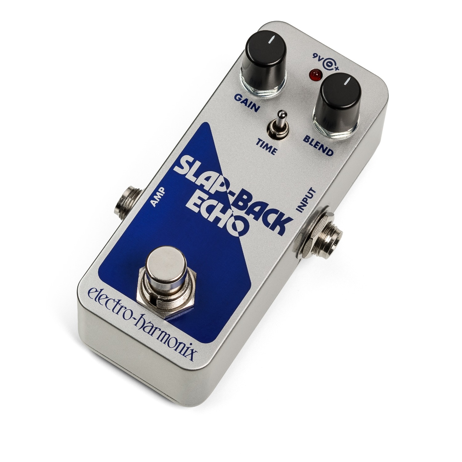 De Slap-Back Echo is een moderne heruitgave van een van de eerste EHX-klassiekers: een warme, korte delay die het geluid van de jaren vijftig typeerde. Met drie instelbare delaytijden (45, 65 of 100 ms) creëer je die kenmerkende rockabilly- of old-school popklank. De Gain-regeling voegt subtiele analoge saturatie toe, en met Blend bepaal je de verhouding tussen droog en effect. True Bypass houdt je signaal zuiver. Klein, eenvoudig en boordevol vintage-sfeer.