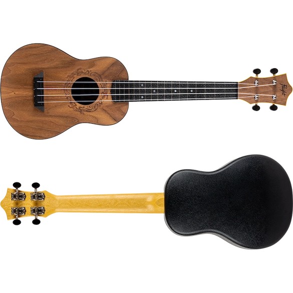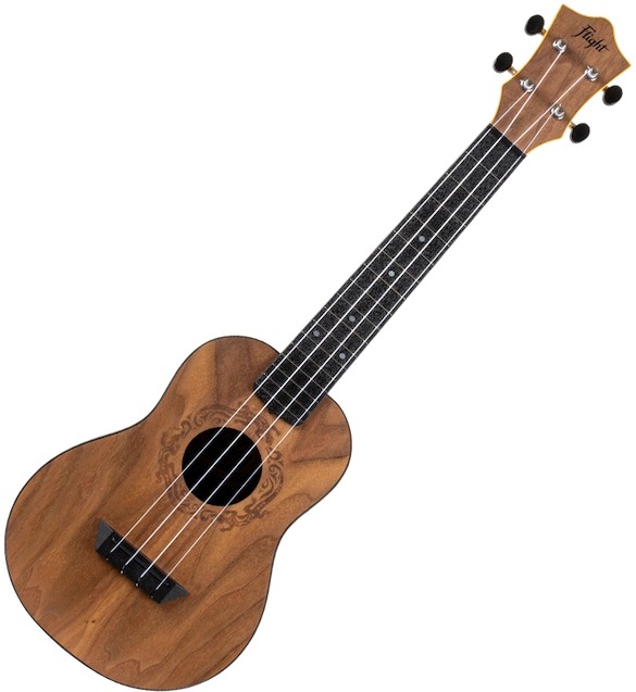 Flight Travel Ukuleles have been acclaimed for their great sound, playability, durability, and value.  Flight Concert Travel Ukuleles (TUC) have a slightly larger body and a slightly longer fretboard than the Soprano Travel Ukulele, resulting in a larger sound–all the great qualities of the TUS, but bigger.  Players with larger hands will enjoy the extra room on the fretboard.The Flight TUC-50 uses laminate walnut for the sound board. Walnut is stiffer and denser than Mahogany, so its tone is brighter, as bright as Koa. The beautiful grain, paired with our hand-drawn Salamander design, is popular throughout the world.  The ukulele also incorporates an ABS body, neck, fretboard and bridge. The result is a ukulele with low action that is easy to clean and maintain.  Want a ukulele that is tough, looks awesome, sounds great, plays well, and is ideal for players of any skill level?  If so, check out the Flight TUC-50 Concert Travel Ukulele at your local Flight dealer!