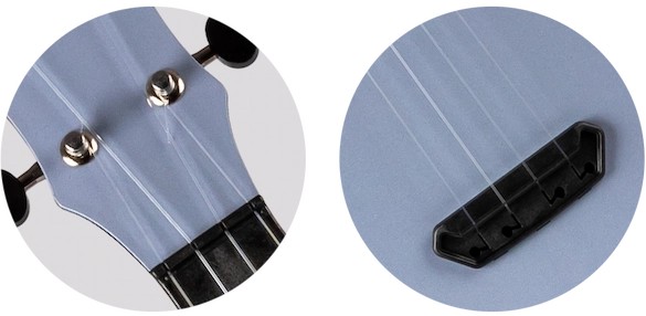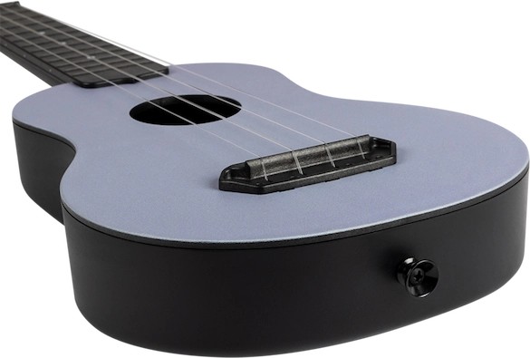 • Premium Features:  Polycarbonate Reinforced Plastic Construction,  Rounded Back, Flight Fluorocarbon Strings, Strap Button, Zero Fret, Thin Soundboard with Lattice Bracing,  Slotted Bridge, Front and Side Position Markers, Open Geared Tuners, and Drawstring Gig Bag.