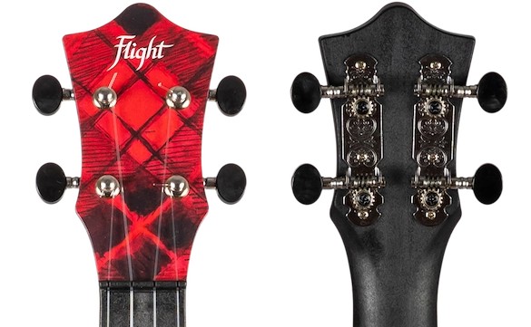 • Premium Features:  Polycarbonate Reinforced Plastic Construction,  Rounded Back, Flight Fluorocarbon Strings, Strap Button, Zero Fret, Thin Soundboard with Lattice Bracing,  Slotted Bridge, Front and Side Position Markers, Open Geared Tuners, and Drawstring Gig Bag.