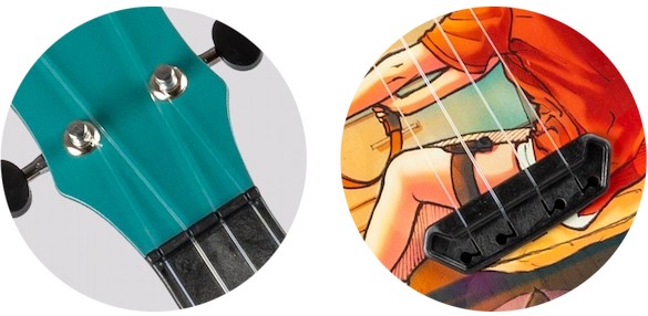 • Premium Features:  Polycarbonate Reinforced Plastic Construction,  Rounded Back, Flight Fluorocarbon Strings, Strap Button, Zero Fret, Thin Soundboard with Lattice Bracing,  Slotted Bridge, Front and Side Position Markers, Open Geared Tuners, and Drawstring Gig Bag.