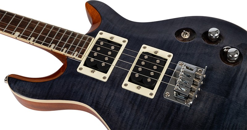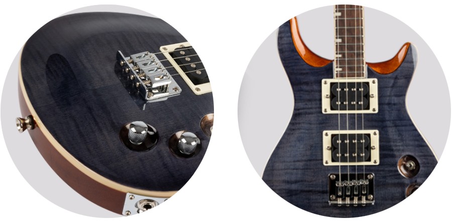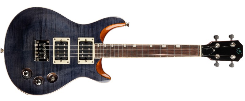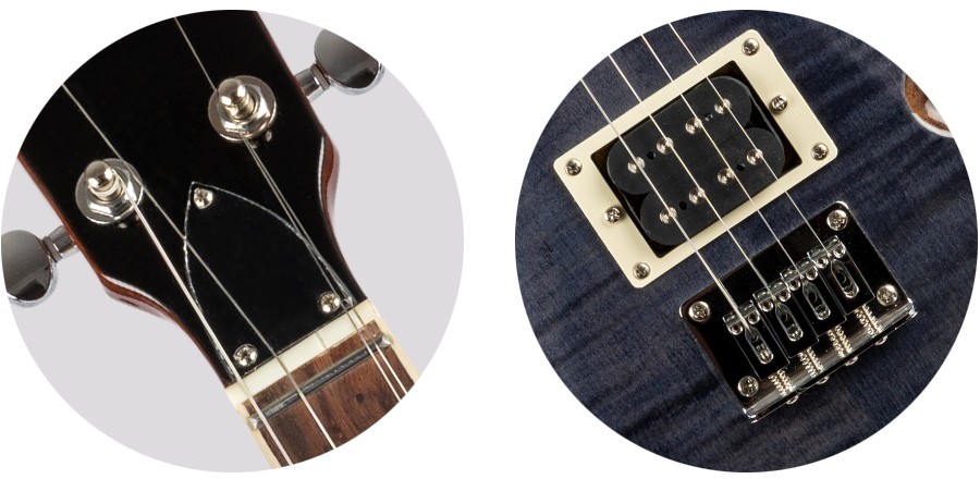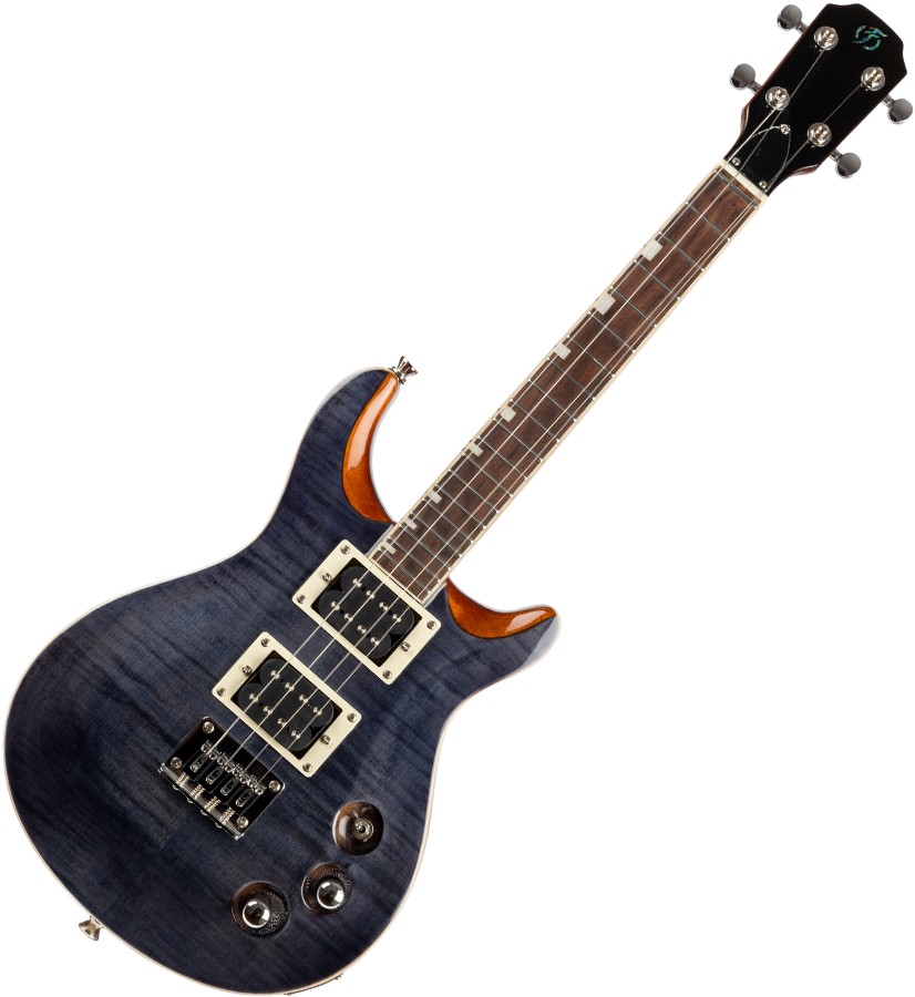 • Premium Features: Tenor ukulele, electric ukulele, metal strings, flamed maple top, solid body, double cutaway, mahogany body and neck, black veneer headstock, bound fretboard, bone nut, zero fret, inlay position markers, side position markers, closed geared tuners, dual humbucker pickups in HH configuration, one volume control, one tone control, three-way switch, hardtail fixed bridge.