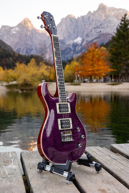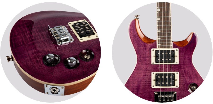 Are you ready to rock? The Flight Vanguard Tenor, Transparent Purple,  Solid Body Tenor Ukulele is a dual cutaway steel string electric ukulele, offering the tonal possibilities of a true electric ukulele from the trusted name of Flight Ukulele. The ukulele itself has a gorgeous flamed maple top in transparent purple with mahogany body and neck and slick looking offset stripe fret markers. The ukulele features white ABS binding, hardtail fixed bridge, back-through stringing, dual humbucker pickups, chrome hardware, single controls for volume and tone, and a three way switch. With its classic looks and fantastic sound, you’ll be ready to rock in any venue, as well as to add any effect pedals, or stompboxes to your final amplified sound. Flight Electric Ukuleles represent great value and high quality–so buy yours today and take Flight on your electric journey!